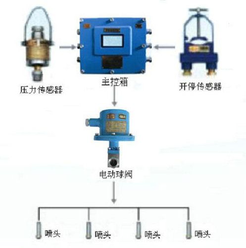 主控箱安裝在采煤機機頭位置,接AC127V電源。電動球閥串接在水幕與進水管之間。水壓傳感器安裝在灑水噴霧的水路中,開停傳感器安裝在采煤機動力電纜上(或將光控傳感器安裝到采煤機工作燈的上方)。